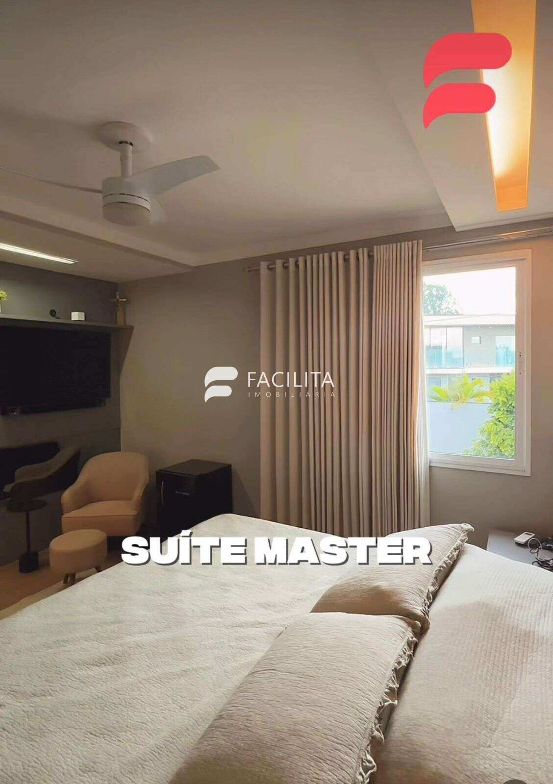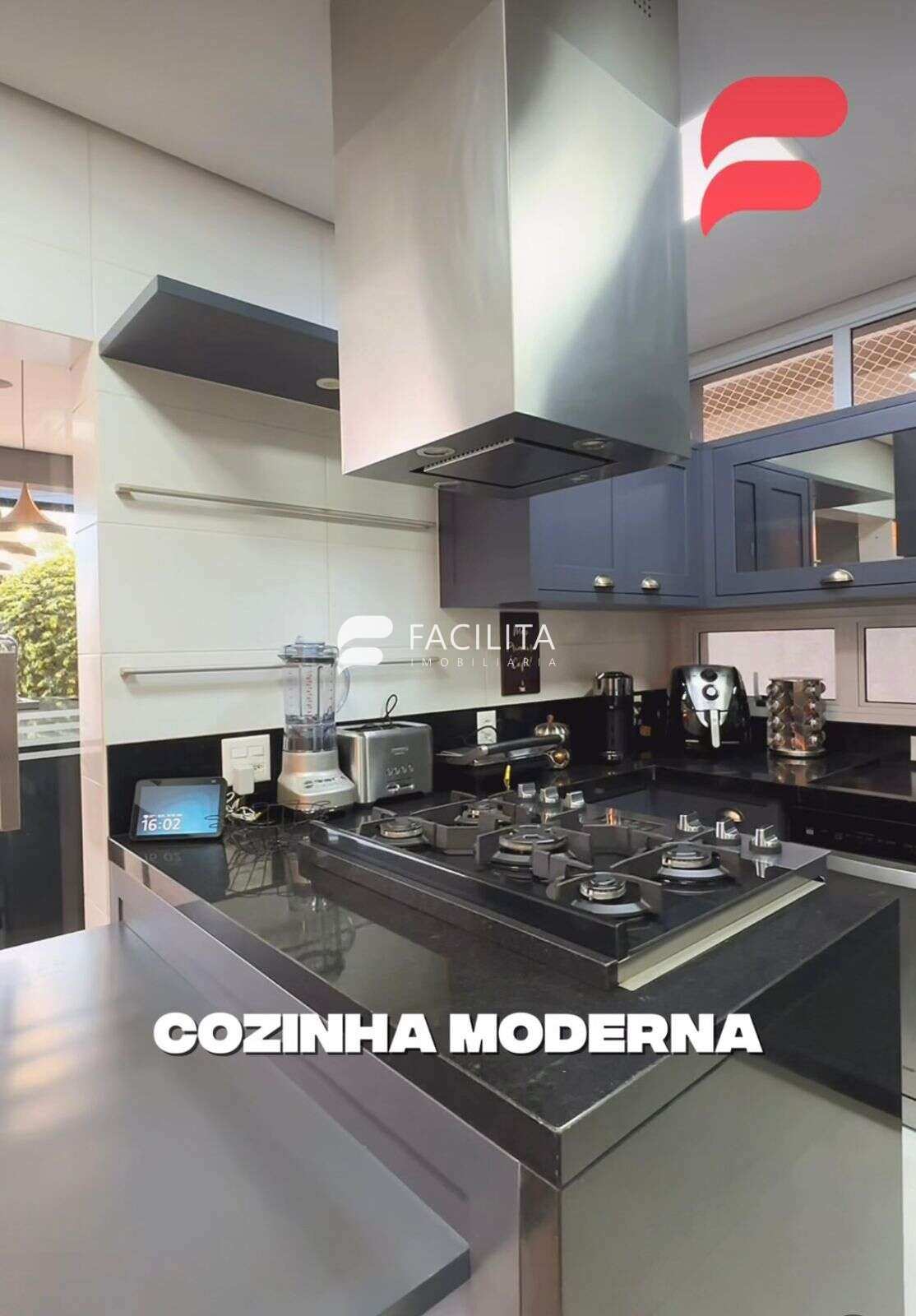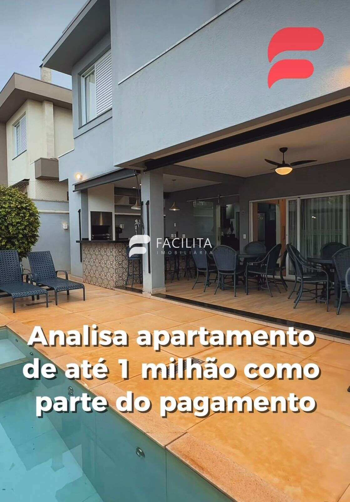 Sobrado com 3 Suítes no piso superior, e 01 suíte/escritório no piso térreo, sala para 2 ambientes com pé direito alto, cozinha separada com armarios modernos e novos, forno e cooktop, espaço para máquina de lavar louças, despensa, lavanderia e wc, varanda gourmet com chopeira, piscina aquecida, jardim com gazebo para balanço, vestiário. Ambientes climatizados, cortinas, fotovoltaica. 04 vagas de garagens.
